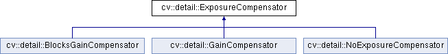 Implemented in cv::detail::BlocksGainCompensator, cv::detail::GainCompensator, and cv::detail::NoExposureCompensator.