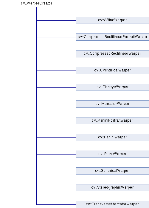 Implemented in cv::TransverseMercatorWarper, cv::MercatorWarper, cv::PaniniPortraitWarper, cv::PaniniWarper, cv::CompressedRectilinearPortraitWarper, cv::CompressedRectilinearWarper, cv::StereographicWarper, cv::FisheyeWarper, cv::SphericalWarper, cv::CylindricalWarper, cv::AffineWarper, and cv::PlaneWarper.