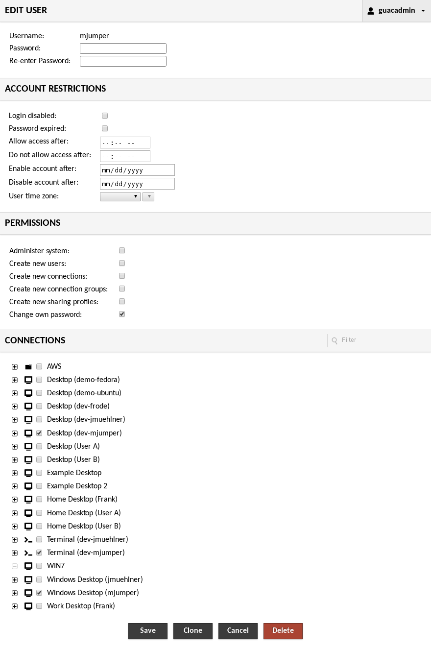 To edit a user, just click on the user you wish to edit. You will be taken to a screen which allows you to change the user's password, expire their password (such that it must be changed at next login), add or remove administrative permissions, and add or remove read access to specific connections, sharing profiles, or groups. If you are managing a large number of connections or groups and wish to reduce the size of the list displayed, you can do so by specifying search terms within the "Filter" field. Groups will be filtered by name and connections will be filtered by name or protocol.