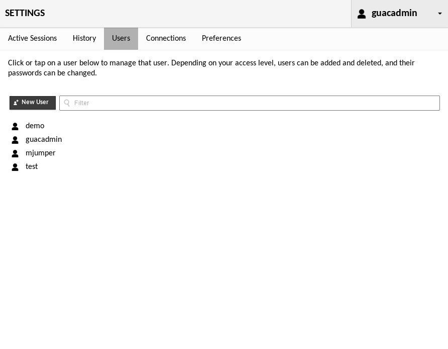 If you are using the default authentication mechanism, or another authentication extension, this chapter probably does not apply to you, and the management options will not be visible in the Guacamole interface. If, on the other hand, you are using one of the database authentication providers, and you are logged in as a user with sufficient privileges, you will see management sections listed within the settings screen: