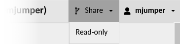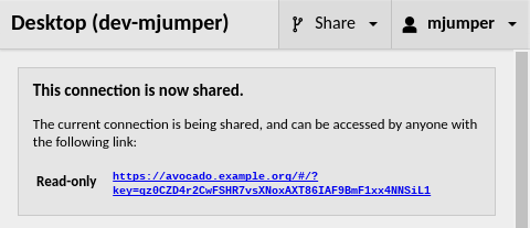 If the Guacamole server is configured to allow connection sharing, and you have been granted permission to share the current connection, an additional "Share" menu will appear next to your username in the Guacamole menu. Clicking on this menu opens a list of options for sharing the current connection.