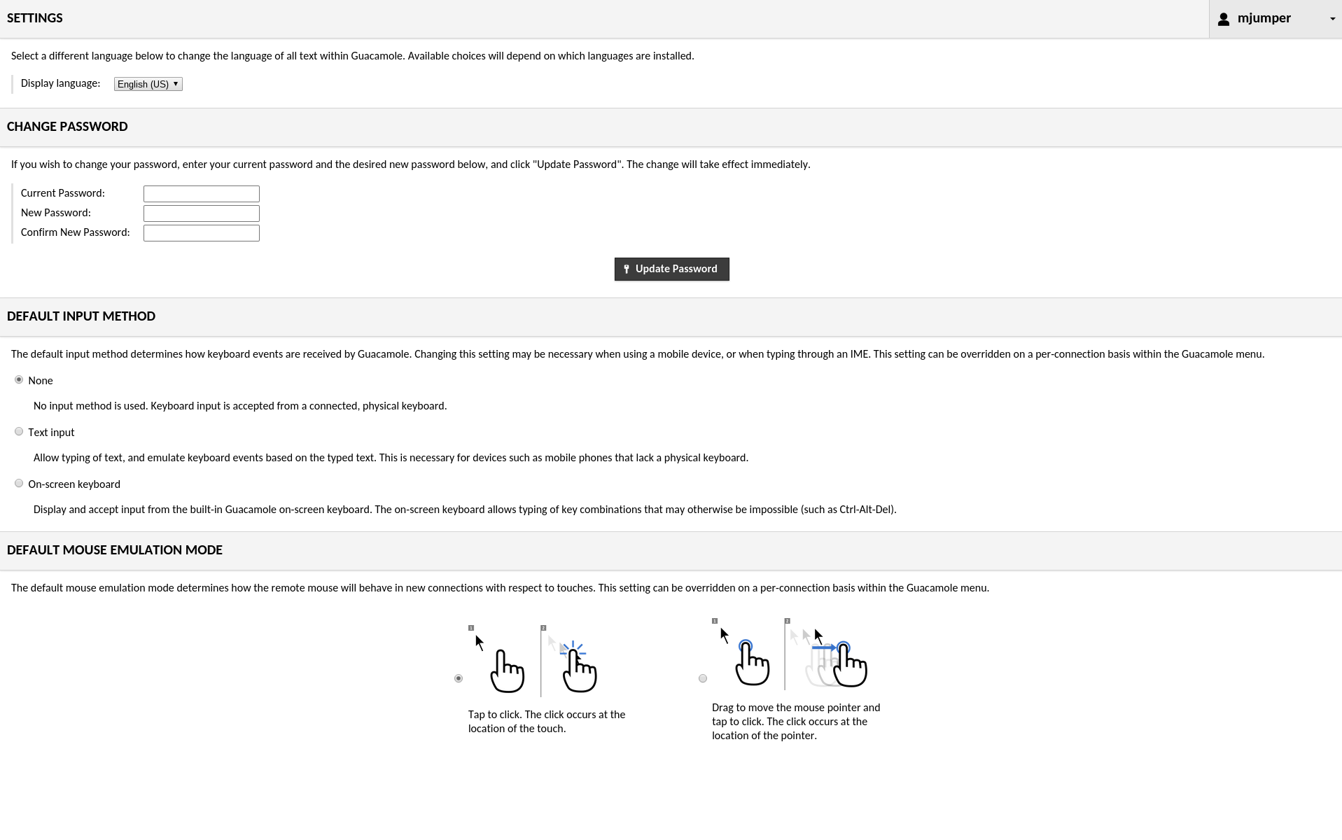 User preferences can be changed within the settings screen. These preferences are stored locally within the browser, so if you use multiple computers to access Guacamole, you can have different settings for each location. The settings screen allows users to change the language of the Guacamole interface, to change the default input method used by Guacamole connections, and to change the default mouse emulation mode for if a touch device is used. If you have sufficient permissions, you may also change your password, or administer the system.