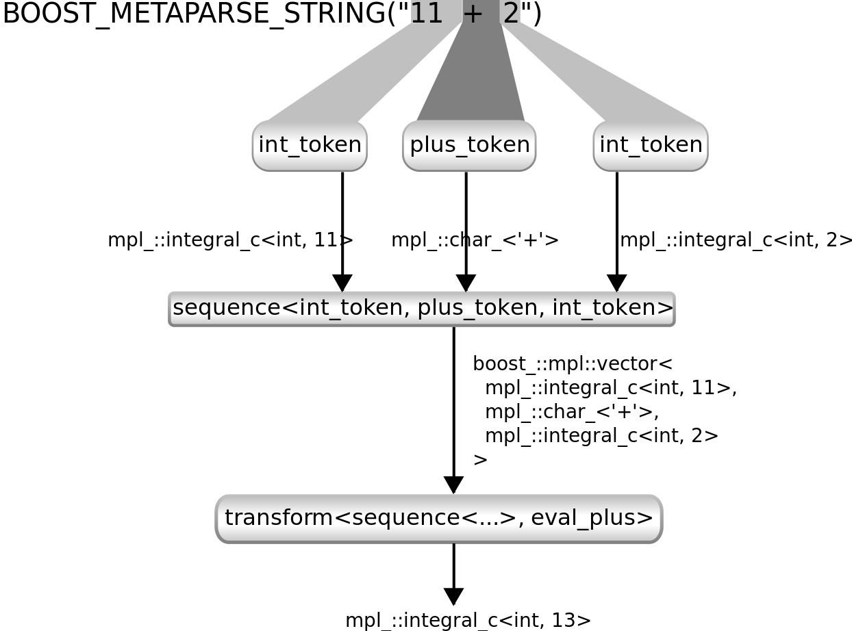using exp_parser9 = build_parser< transform< /* What we had so far */ sequence< int_token, transform< repeated<sequence<plus_token, int_token>>, boost::mpl::lambda< boost::mpl::fold< boost::mpl::_1, boost::mpl::int_<0>, boost::mpl::quote2<sum_items> > >::type > >, boost::mpl::quote1<sum_vector> /* summarise the vector of numbers */ > >;
