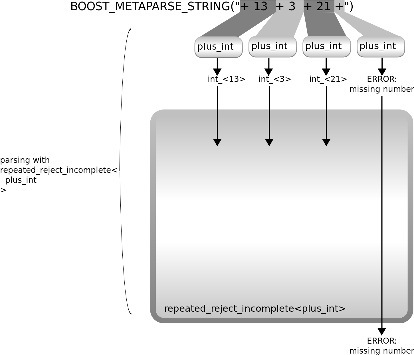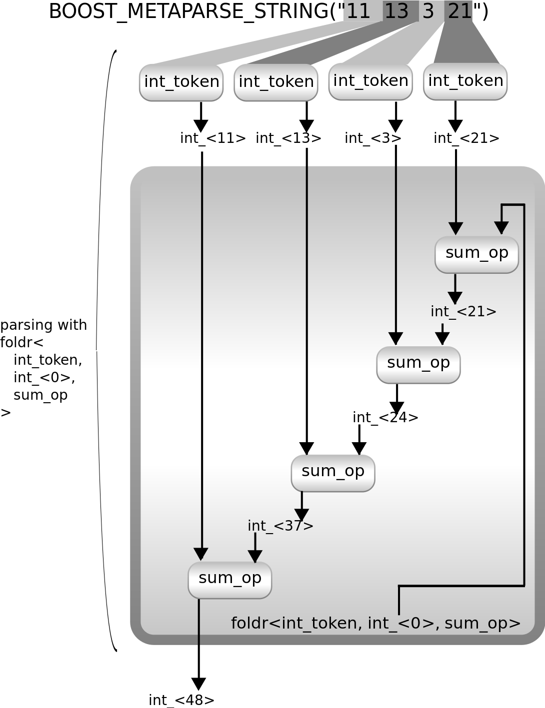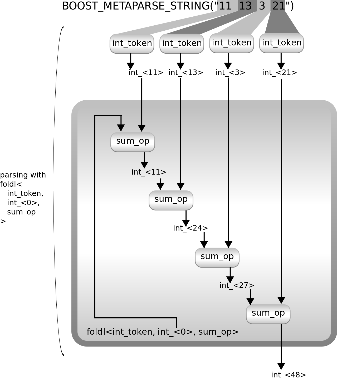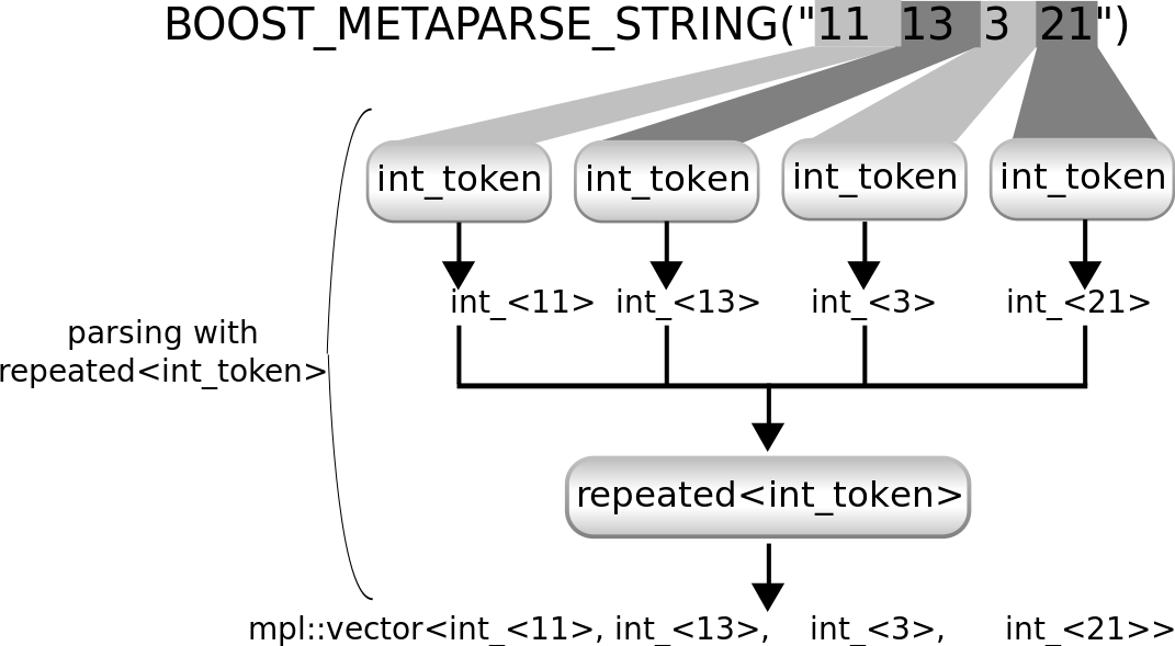 #include <boost/metaparse/token.hpp> #include <boost/metaparse/int_.hpp> #include <boost/metaparse/start.hpp> #include <boost/metaparse/get_result.hpp> #include <boost/metaparse/get_remaining.hpp> #include <boost/metaparse/is_error.hpp> #include <boost/metaparse/string.hpp> #include <type_traits> using namespace boost::metaparse; using int_token = token<int_>; static_assert( get_result< int_token::apply<BOOST_METAPARSE_STRING("13 "), start> >::type::value, "the result of int_token is the number" ); static_assert( std::is_same< BOOST_METAPARSE_STRING(""), get_remaining<int_token::apply<BOOST_METAPARSE_STRING("13 "), start>>::type >::type::value, "token consumes whitespaces after the number" ); static_assert( get_result< int_token::apply<BOOST_METAPARSE_STRING("13"), start> >::type::value, "whitespaces after the number are optional" ); static_assert( is_error<int_token::apply<BOOST_METAPARSE_STRING("foo"), start>>::type::value, "when there is no number, token fails" );