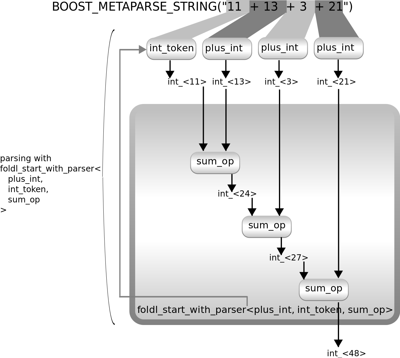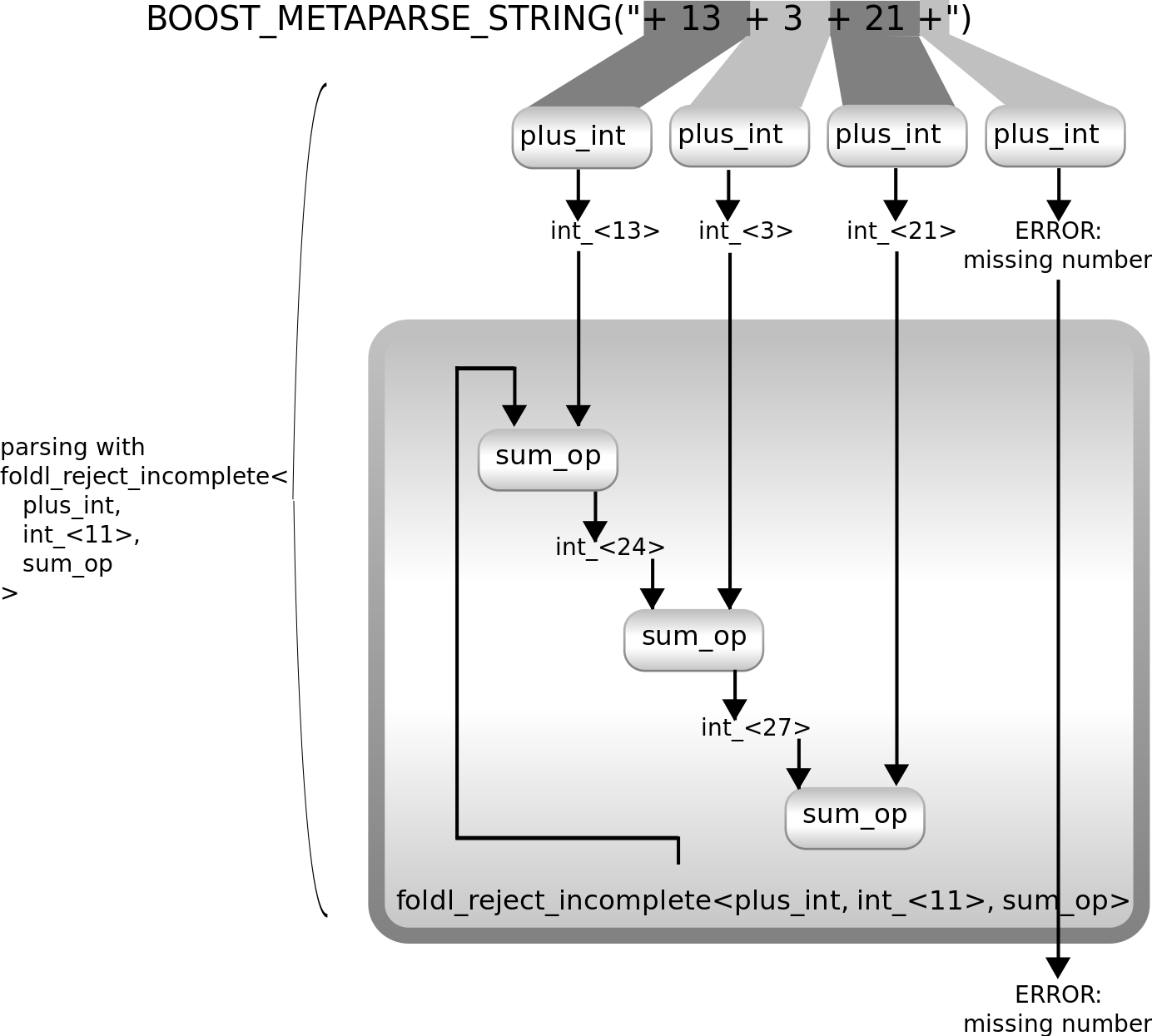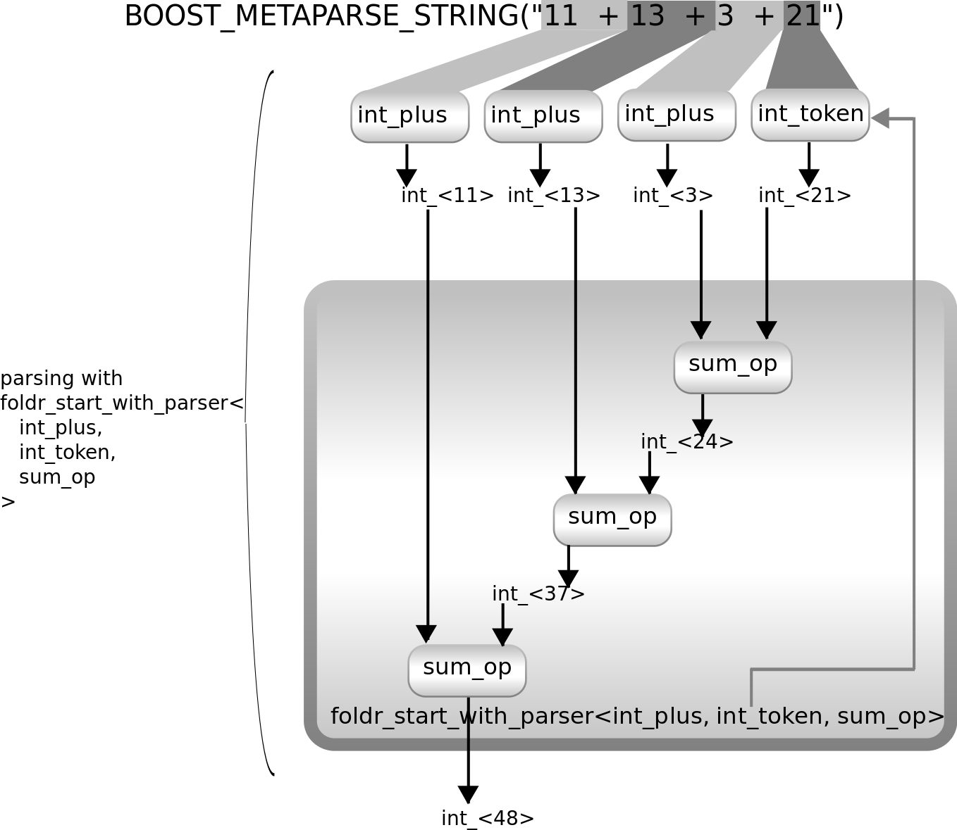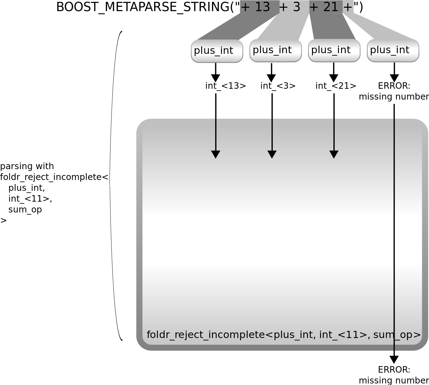 #include <boost/metaparse/token.hpp> #include <boost/metaparse/int_.hpp> #include <boost/metaparse/start.hpp> #include <boost/metaparse/get_result.hpp> #include <boost/metaparse/get_remaining.hpp> #include <boost/metaparse/is_error.hpp> #include <boost/metaparse/string.hpp> #include <type_traits> using namespace boost::metaparse; using int_token = token<int_>; static_assert( get_result< int_token::apply<BOOST_METAPARSE_STRING("13 "), start> >::type::value, "the result of int_token is the number" ); static_assert( std::is_same< BOOST_METAPARSE_STRING(""), get_remaining<int_token::apply<BOOST_METAPARSE_STRING("13 "), start>>::type >::type::value, "token consumes whitespaces after the number" ); static_assert( get_result< int_token::apply<BOOST_METAPARSE_STRING("13"), start> >::type::value, "whitespaces after the number are optional" ); static_assert( is_error<int_token::apply<BOOST_METAPARSE_STRING("foo"), start>>::type::value, "when there is no number, token fails" );