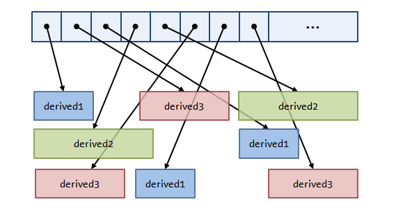 std::vector<base*> v; ... v.insert(new derived2{...}); // the type derived2 is "forgotten" by v