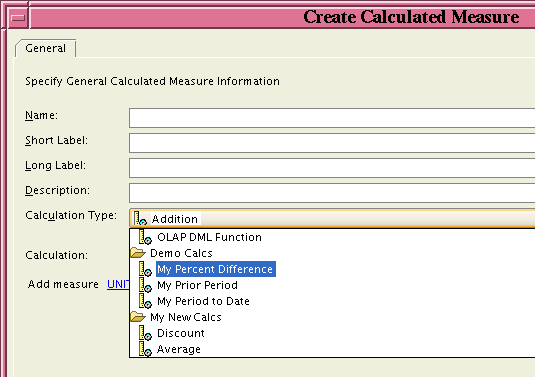 Open Analytic Workspace Manager. The new categories and templates appear at the end of the Calculation Type list in the Create Calculated Measure dialog box.