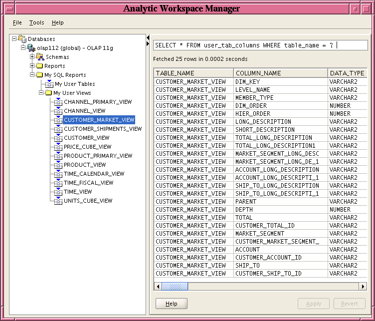 Analytic Workspace Manager provides numerous SQL reports so that you can query the Oracle Database data dictionary and system tables without having to open another SQL interface. It also provides an extensive list of templates for generating calculated measures. You can supplement both of these features by adding custom SQL reports and calculation templates.