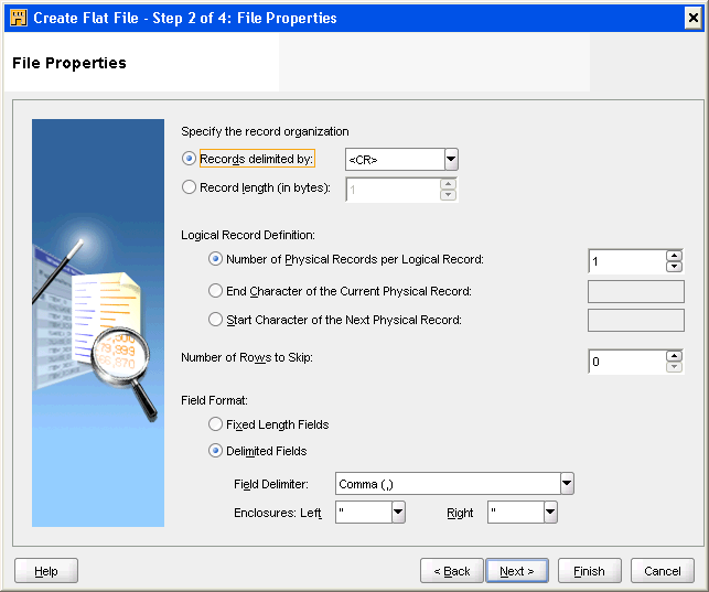 The Flat File Sample Wizard enables you to view a sample of the flat file and to define record organization and file properties. The wizard enables you to sample and define common flat file formats such as string and ASCII. See "Using the Flat File Sample Wizard".