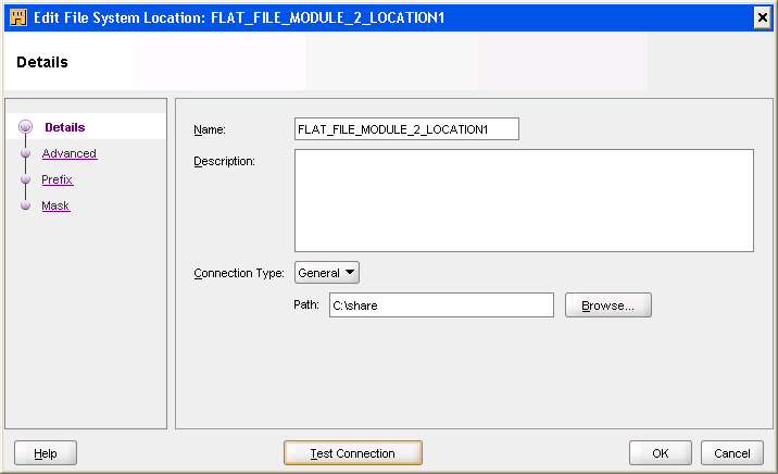 Locations for flat file modules identify the paths in the file system from which you sample existing files or to which you create new files. You can define a new location or select an existing location on the Connection Information page.
