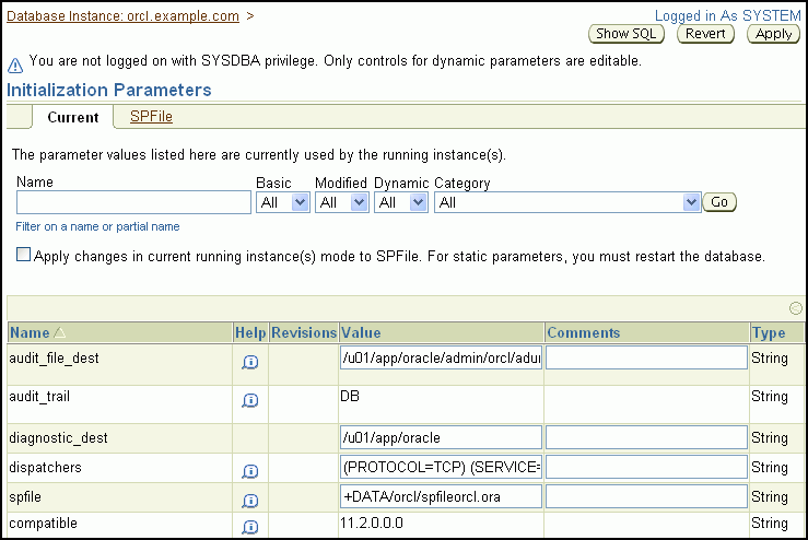For example, to view only initialization parameters that have the text DEST anywhere in the parameter name, enter dest in the Name field, and then click Go.