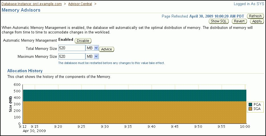 The Memory Advisors page appears with the SGA subtab (in the middle of the page) displayed by default.
