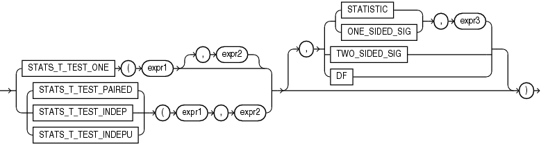 The t-test measures the significance of a difference of means. You can use it to compare the means of two groups or the means of one group with a constant. The one-sample and two-sample STATS_T_TEST_* functions take three arguments: two expressions and a return value of type VARCHAR2. The functions return one number, determined by the value of the third argument. If you omit the third argument, then the default is TWO_SIDED_SIG. The meaning of the return values is shown in Table 5-9.
