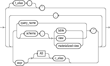 "Joins"Specify an expression representing the information you want to select. A column name in this list can be qualified with schema only if the table, view, or materialized view containing the column is qualified with schema in the FROM clause. If you specify a member method of an object type, then you must follow the method name with parentheses even if the method takes no arguments.