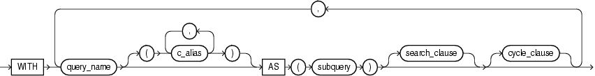 The column aliases following the query_name and the set operators separating multiple subqueries in the AS clause are valid and required for recursive subquery factoring. The search_clause and cycle_clause are valid only for recursive subquery factoring but are not required. See "Recursive Subquery Factoring".