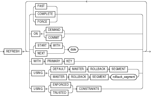 "Complete Refresh: Example"Specify FORCE if, when a refresh occurs, you want Oracle Database to perform a fast refresh if one is possible or a complete refresh otherwise.