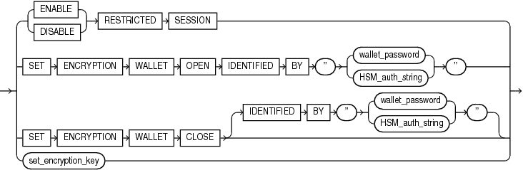 (archive_log_clause ::=, checkpoint_clause::=, check_datafiles_clause::=, distributed_recov_clauses::=, end_session_clauses::=, quiesce_clauses::=, rolling_migration_clauses::=, security_clauses::=, shutdown_dispatcher_clause::=, alter_system_set_clause::=, alter_system_reset_clause::=)