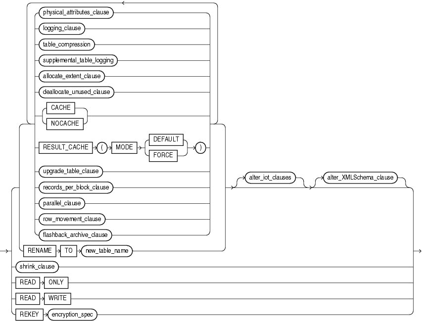 (physical_attributes_clause::=, logging_clause::=, table_compression ::=, supplemental_table_logging ::=, allocate_extent_clause ::=, deallocate_unused_clause::= , upgrade_table_clause ::=, records_per_block_clause ::=, parallel_clause::=, row_movement_clause::=, flashback_archive_clause::=, shrink_clause::=, alter_iot_clauses::=, alter_XMLSchema_clause::=)