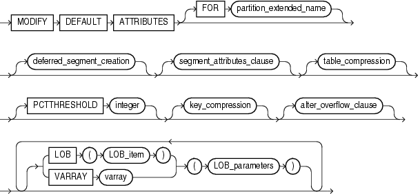 (modify_table_default_attrs ::=, alter_interval_partitioning::=, set_subpartition_template ::=, modify_table_partition::=, modify_table_subpartition::=, move_table_partition::=, move_table_subpartition::=, add_table_partition::=, coalesce_table_partition::=, coalesce_table_subpartition::=, drop_table_partition::=, drop_table_subpartition ::=, rename_partition_subpart::=, truncate_partition_subpart::=, split_table_partition::=, split_table_subpartition ::=, merge_table_partitions ::=, merge_table_subpartitions ::=, exchange_partition_subpart ::=