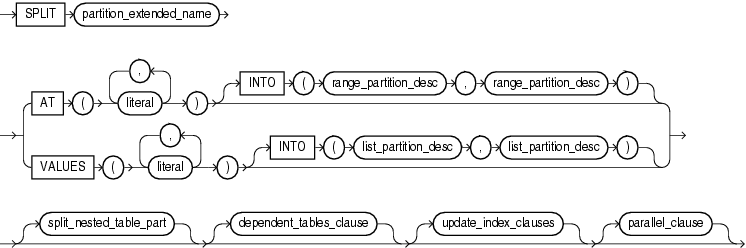 (partition_extended_name::=, range_partition_desc::=, list_partition_desc::=, dependent_tables_clause:=, update_index_clauses::=, parallel_clause::=)