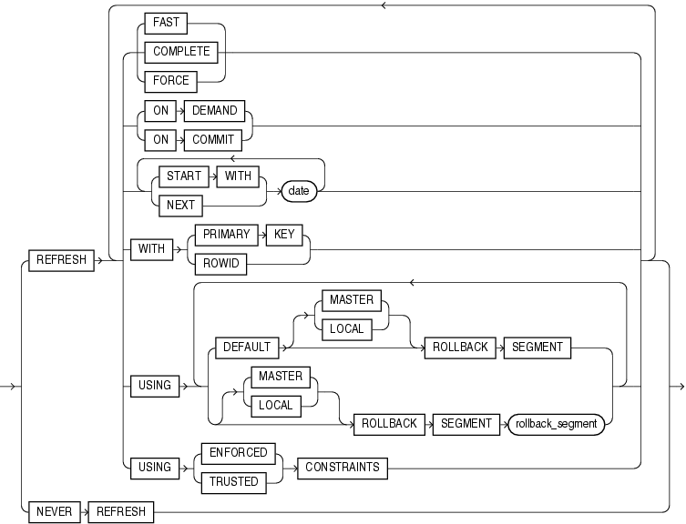 This clause only sets the default refresh options. For instructions on actually implementing the refresh, refer to Oracle Database Advanced Replication and Oracle Database Data Warehousing Guide.See Also:
