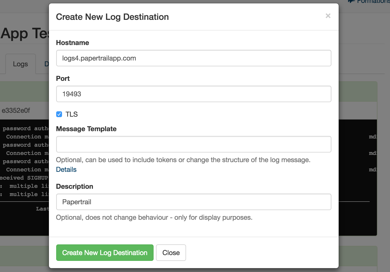 For anything more than a quick look at your logs, we recommend setting up an external provider. Through this method the logs will transmit to a dedicated logging service and you can analyze and retain them according to your own preferences. To use an external provider, create a new logging destination in the Citus Cloud console. For instance, here is the new destination dialog filled in with Papertrail settings: