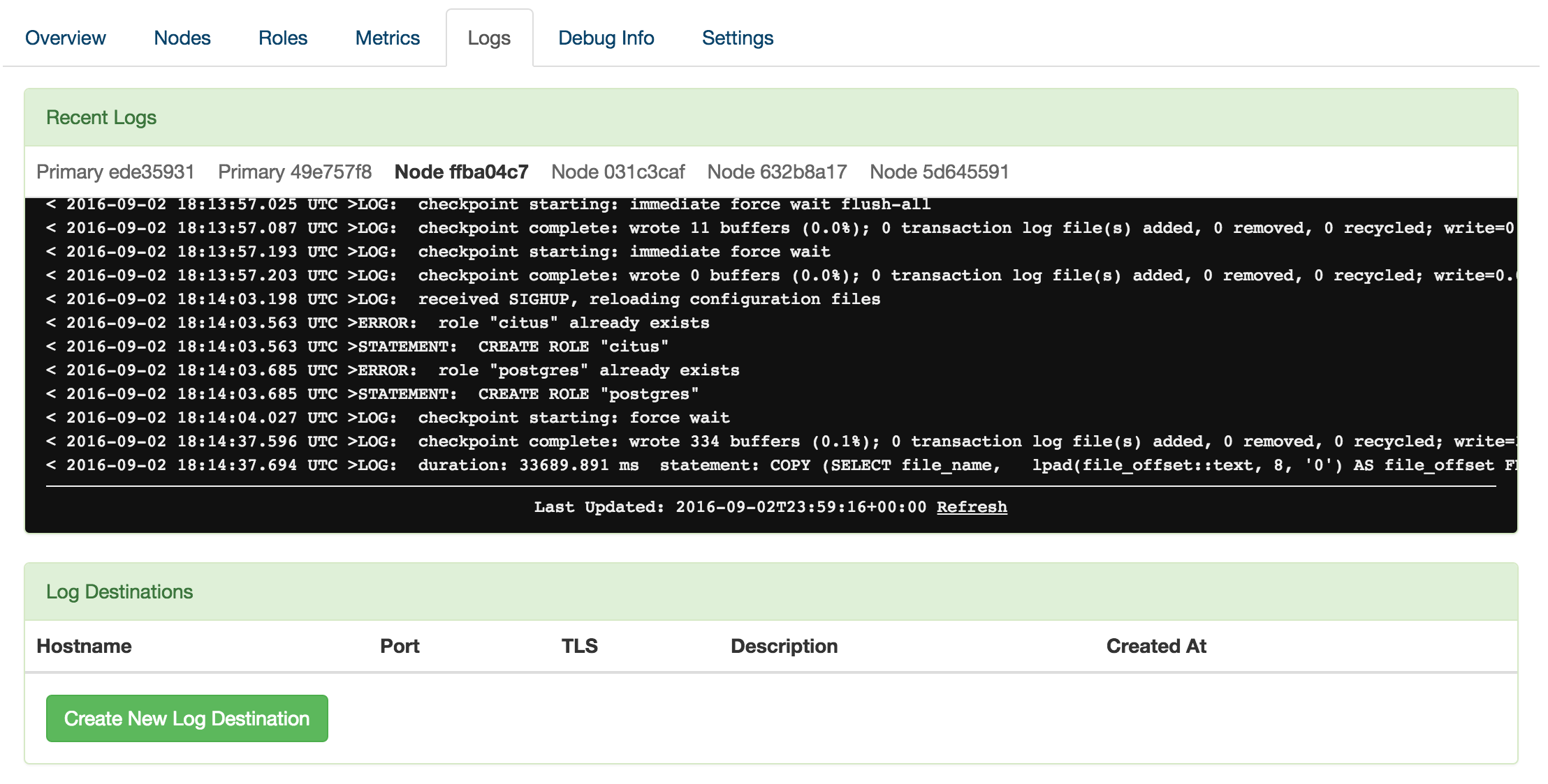 The Citus Cloud dashboard automatically shows you the most recent 100 log lines from each of your servers. You don’t need to configure anything to access this information.