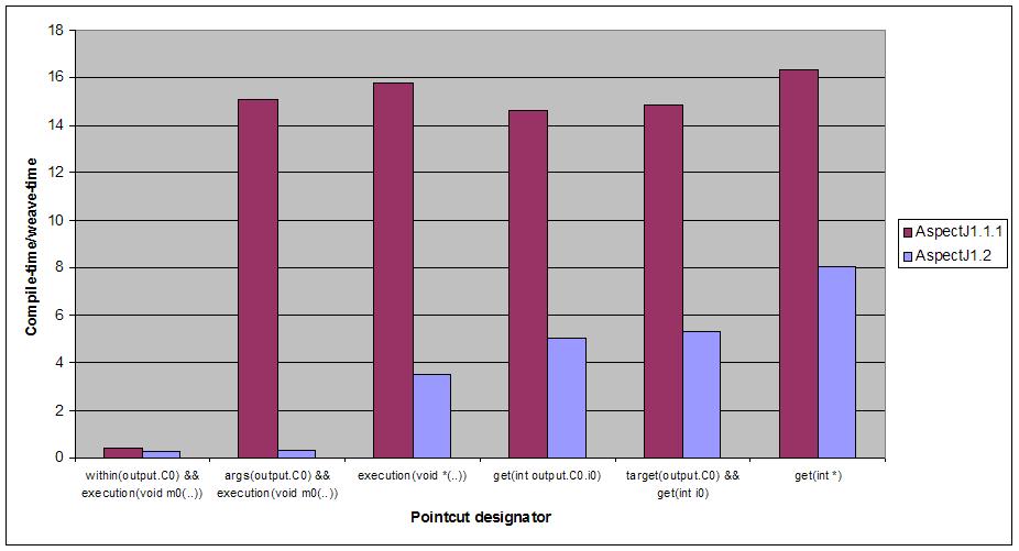 Our benchmark suite shows that AspectJ 1.2 is at least twice as fast in the weaving phase as AspectJ 1.1.1 for matches based on a variety of pointcut expressions (see the chart above). We've also made the base incremental compilation implementation in AspectJ 1.2 approximately twice as fast as in AspectJ 1.1.1, so when this is combined with the weave time improvements you should see speed-ups of up to 4x for incremental compilation.