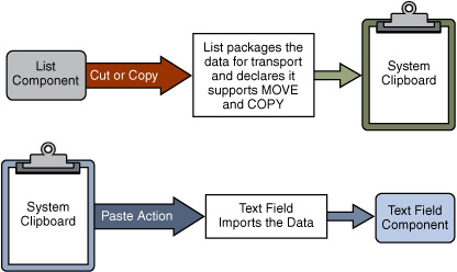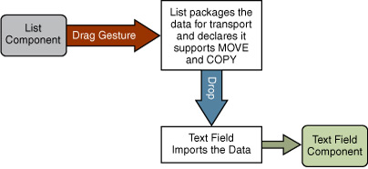 Let us say there is a user named Rollo, who is running a Java application. He wants to drag some text from a list and deposit it into a text field. (Note that the process is the same when dragging from a native application to a Java application.) In a nutshell, the drag and drop process works like this: