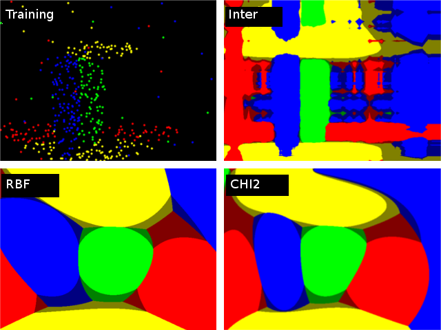 A comparison of different kernels on the following 2D test case with four classes. Four SVM::C_SVC SVMs have been trained (one against rest) with auto_train. Evaluation on three different kernels (SVM::CHI2, SVM::INTER, SVM::RBF). The color depicts the class with max score. Bright means max-score > 0, dark means max-score < 0.
