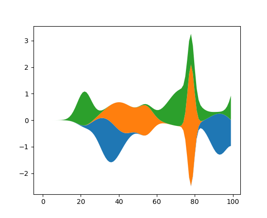 plt.stackplot(range(100), d.T, baseline='wiggle')