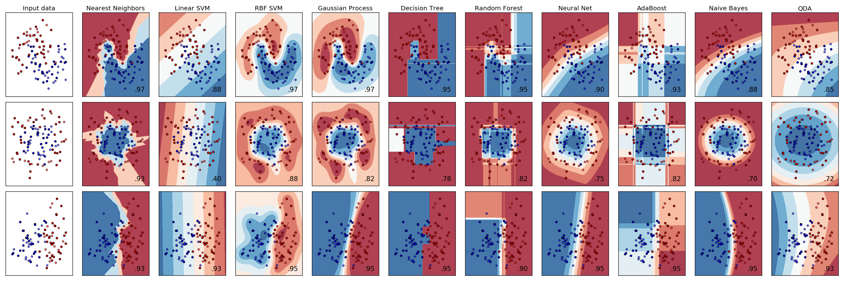 A comparison of a several classifiers in scikit-learn on synthetic datasets. The point of this example is to illustrate the nature of decision boundaries of different classifiers. This should be taken with a grain of salt, as the intuition conveyed by these examples does not necessarily carry over to real datasets.