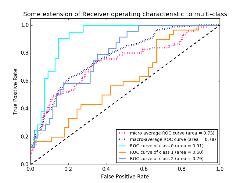 ROC curves are typically used in binary classification to study the output of a classifier. In order to extend ROC curve and ROC area to multi-class or multi-label classification, it is necessary to binarize the output. One ROC curve can be drawn per label, but one can also draw a ROC curve by considering each element of the label indicator matrix as a binary prediction (micro-averaging).