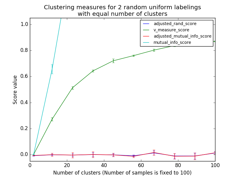 - Random (uniform) label assignments have a FMI score close to 0.0