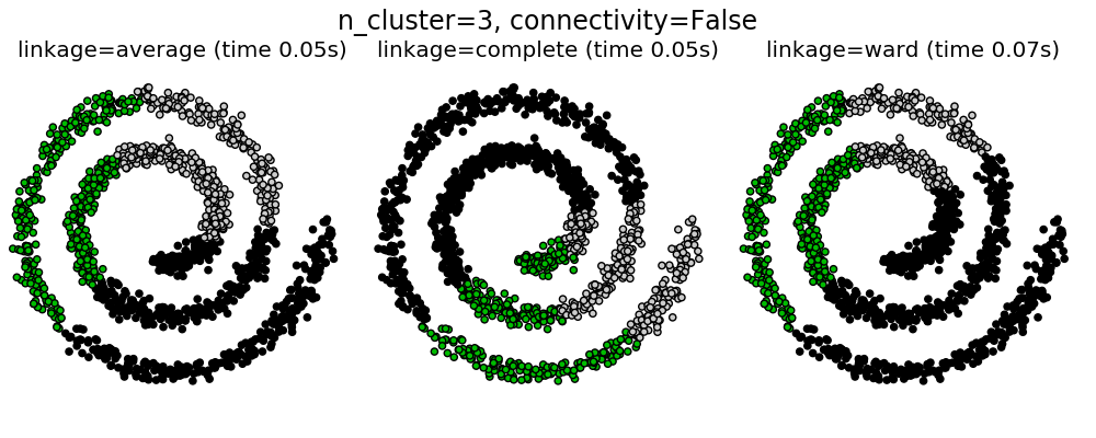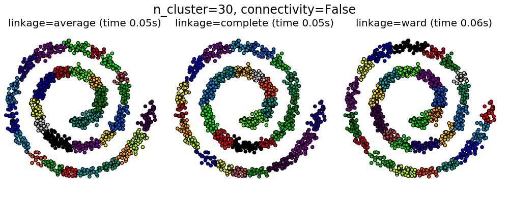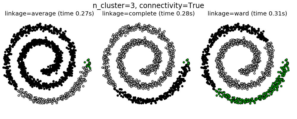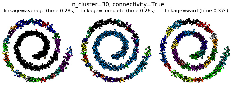 | Agglomerative clustering | number of clusters, linkage type, distance | Large n_samples and n_clusters |