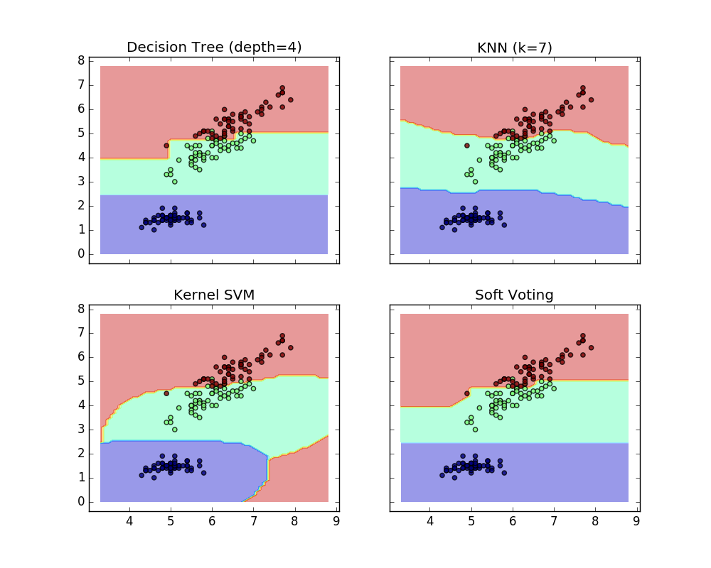 The following example illustrates how the decision regions may change when a soft VotingClassifier is used based on an linear Support Vector Machine, a Decision Tree, and a K-nearest neighbor classifier: