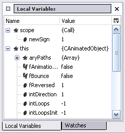 The onFlipX function in Figure 1, for example, uses the variable newSign to figure out what image to use for the fish. When you set a breakpoint at line 81, you can start animation on the web page in the browser window and see Venkman stop execution as it enters the onFlipX function. Stopped there, Venkman displays the value of the newSign variable as "1" in the Local Variables View.