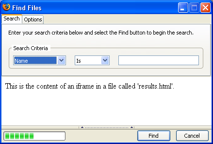 Here, a splitter and an iframe have been added to the dialog. We don't need the after the spacer any more so we can remove it. The content of the frame is contained in a file called 'tabboxresults.html'. Create this file and put whatever you want in it for now. The iframe will be replaced later with a results list when we know how to create it. For now, it serves to demonstrate the splitter.