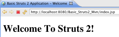 Open a web browser and go to http://localhost:8080/Basic_Struts2_Mvn/index.action (note that's index.action not index.jsp at the end of the URL). You should see the same web page as when going to http://localhost:8080/Basic_Struts2_Mvn/index.jsp. View the log messages written to the console and you should find several that discuss index.action and index.jsp: