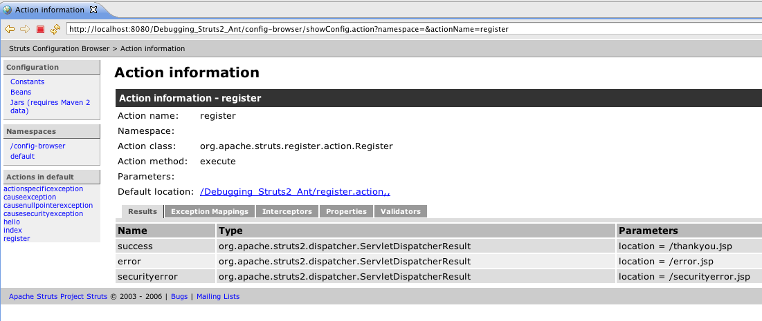 You may then click on one of the tabs (Results, Exception Mappings, Interceptors, Properties, Validators) to get more information about how the Struts 2 framework is has configured that specific action.