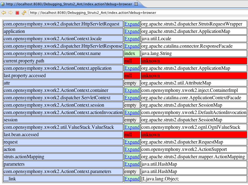 Note that to enable the correct display and interaction of the expand/collapse links on the debugging information web page you need to include the s:head tag in your JSP's head section (see index.jsp in the example application) and also include the Struts 2 dojo plugin in your application's class path. The Struts 2 dojo plugin is available as part of the Struts 2 download and from the Maven repository.