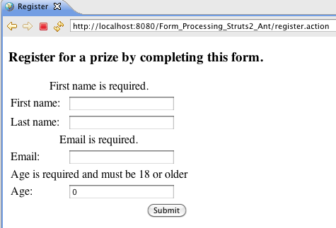 If you have made the above changes to the Processing Forms tutorial or you have downloaded from Google Code either the Form_Validation_Struts2_Ant or Form_Validation_Struts2_Mvn projects run the application (see the README.txt in the project root folder). Click on the Please register link. On the registration form, just click the submit button and you should see: