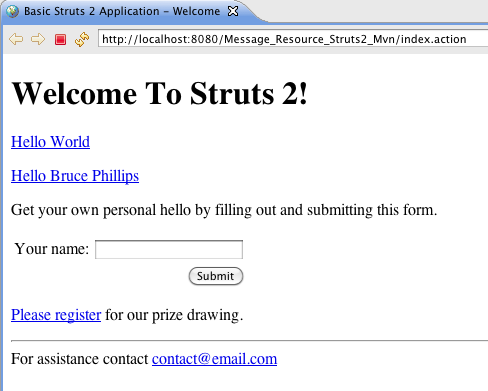 In this tutorial we'll explore using Struts 2 message resource capabilities (also called resource bundles). Message resources provide a simple way to put text in a view page that is the same through out your application, to create form field labels, and to change text to a specific language based on the user's locale (i18n).