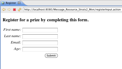 When you click on the Please Register link your browser should display the register.jsp. The form field labels should be the key values from the Register.properties file.