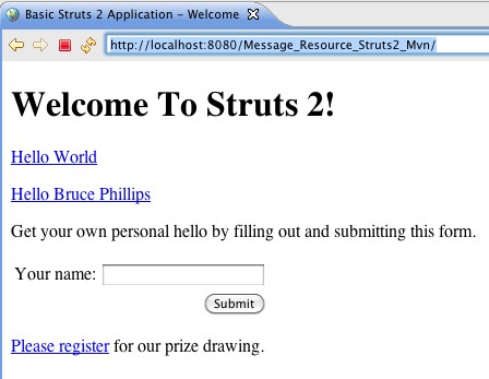To enable the key attribute to find the properties file, the display of the view page must be the result of executing a Struts 2 Action class. Right now if you examine index.jsp from the Form Validation tutorial the link to the register.jsp page is a standard URL.