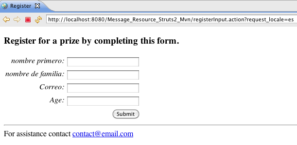 If we implement the same concept by creating _es.properties versions of global.properties (global_es.properties) and package.properties (package_es.properties) then we can create a complete registration web page in Spanish. Download the finished example application for this tutorial from Google Code - http://code.google.com/p/struts2-examples/downloads/list to see those property files and run the complete example with the registration form in Spanish.
