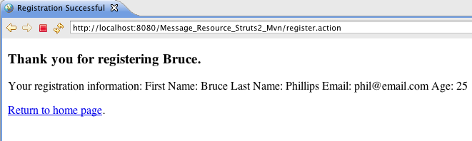 The above is just a standard Java properties file. The key is to the left of the = sign and the value for the key is to the right. When the Register action is executed these properties will be available to the view page by referencing the key name.
