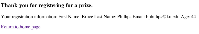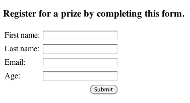 For this tutorial let's say we need to provide a form that a user may submit to register for a prize drawing. Our business rules state the user must provide his/her first name, last name, email address, and age.