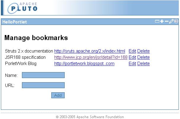 in a command prompt. Open a browser and point your browser to http://localhost:8080/bookmark-portlet/pluto/index.jsp and play around.
