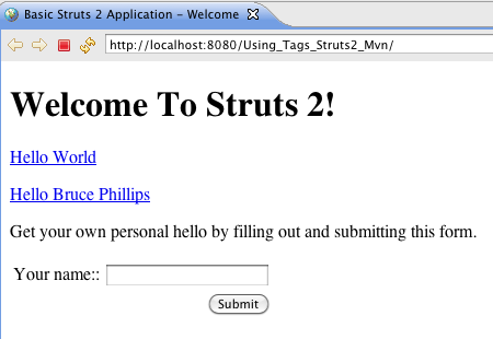 In the Hello World lesson, we added to the index.jsp a Struts 2 url tag to create a hyperlink to the hello.action. This tutorial will explore the url and other Struts 2 tags further.